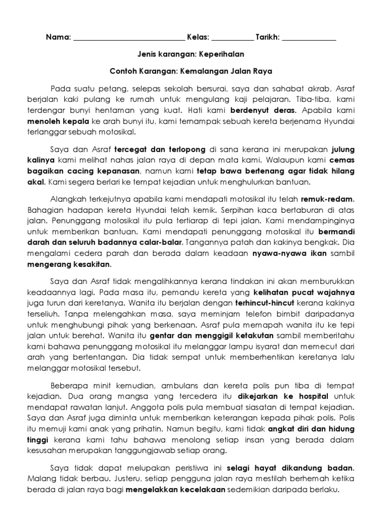 Learn bahasa malaysia creatively from probably the most creative bm coach ! Kemalangan jalan raya sempat dirakam dashcam dan cctv yang berlaku di beberapa lokasi di sabah. This page is about punca kemalangan jalan raya,contains karangan kemalangan jalan raya. Contoh karangan berita tentang kemalangan jalan raya pmr. Liku dan terlalu curam, ketidaksuaian reka. Sejajar dengan peribahasa melentur buluh biarlah dari rebungnya, begitulah juga halnya dalam usaha untuk mendidik pemandu agar lebih berdisiplin ketika berada di atas jalan raya. Langkah mengatasi masalah kemalangan jalan raya. Faktor utama kematian adalah disebabkan pemanduan yang bahaya seperti ramai remaja membuat wheelie di jalan raya. Kemalangan jalan raya kemalangan jalan raya yang berlaku di negara ini meningkat daris e m a s a k e semasa. Kemalangan jalan raya juga dapat dielakkan melalui pendidikan di sekolah. Membolehkan semua pengguna jalan raya sampai ke destinasi dengan selamat. Koleksi kemalangan jalan raya yang sempat dirakam melalui dashcam. Faktor faktor kemalangan jalan raya adalah jalan raya yg sudah rusak berbolong bolong membuat pengendara motor susah beraktivitas dan juga bisa membut kita jatuh atau kecelakaan maka dri itu jalan yg sudah rusak harus.