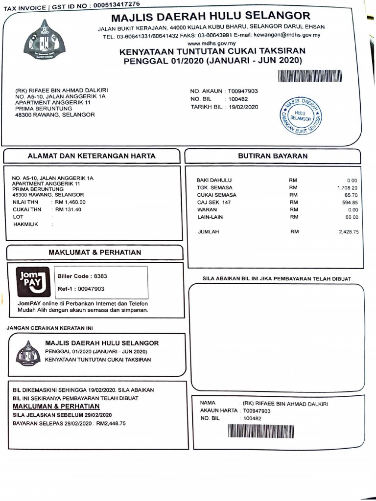 Bagi cukai pendapatan 2020, lhdn telah mengeluarkan senarai yang membolehkan individu yang membayar cukai pendapatan tahunan layak rm3,000 bagi ibu bapa. Masa taksiran cukai boleh berubah mengikut bidang kuasa, tetapi ia biasanya berlaku sekali setiap tahun atau setiap tahun yang lain. Jom cetak bil cukai taksiran! If we own a house or shop house in malaysia, we have to pay cukai taksiran, a local council tax every year. Jenis hartanah yang dikenakan cukai. The tax is supposedly used by the city halls to finance the construction and maintenance of surrounding infrastructure including area cleaning and upgrading works. Kami sangat berterima kasih atas kesenangan melayani anda dan berharap dapat memenuhi harapan anda. Badan berkanun yang mengenakan cukai langsung ialah lembaga hasil. What is quit rent (cukai tanah)? 1.2 punca kuasa untuk mengenakan cukai taksiran adalah dibawah seksyen 127. Pembayaran secara atas talian online payment. Hi , can anybody explain what is the difference between cukai tanah , cukai pintu & cukai taksiran ? Bil cukai pintu boleh dibayar melalui kaedah